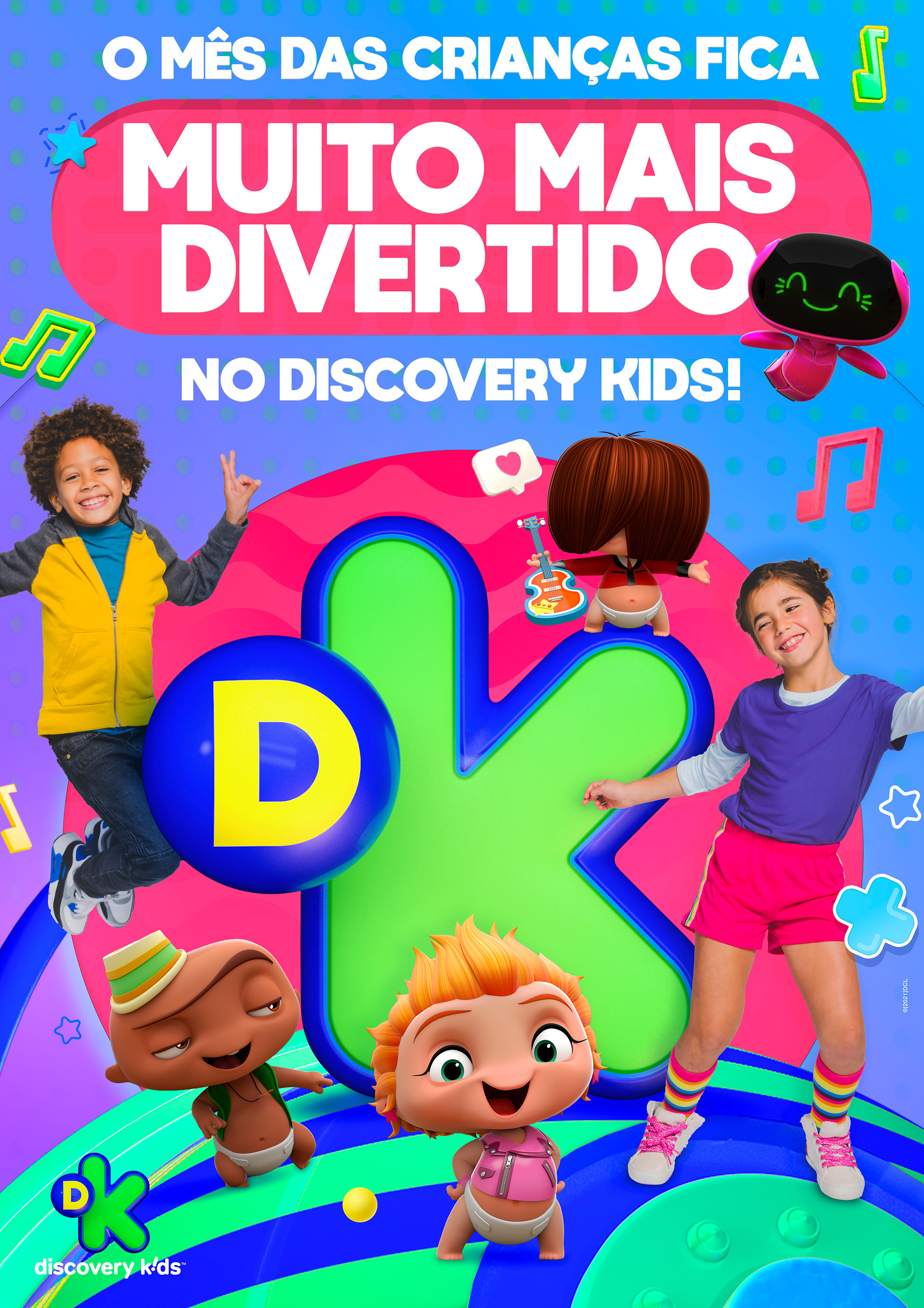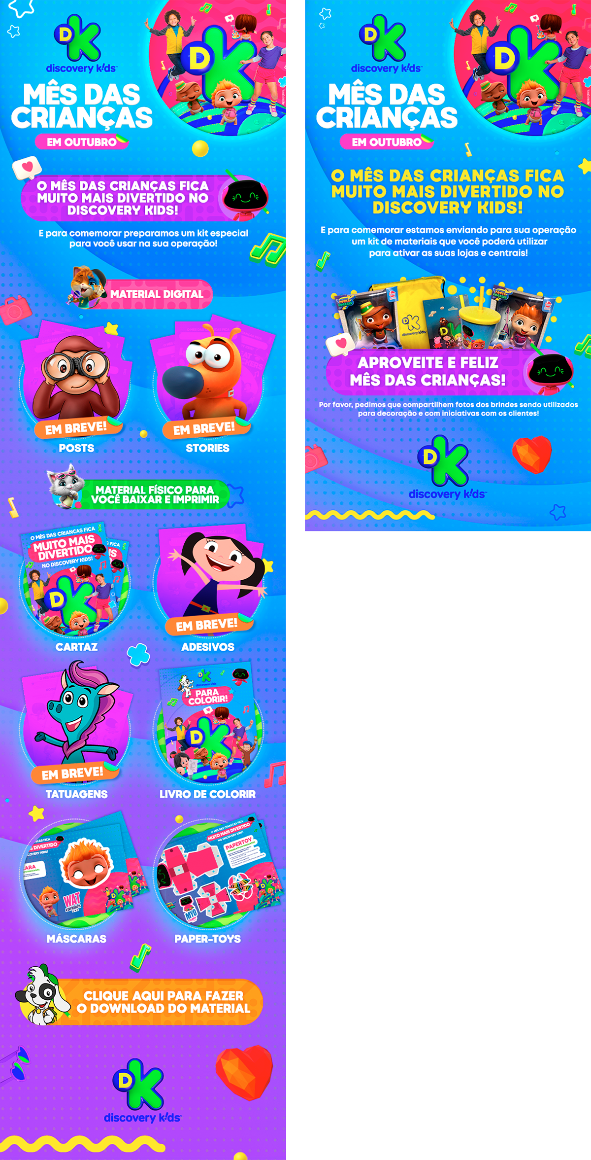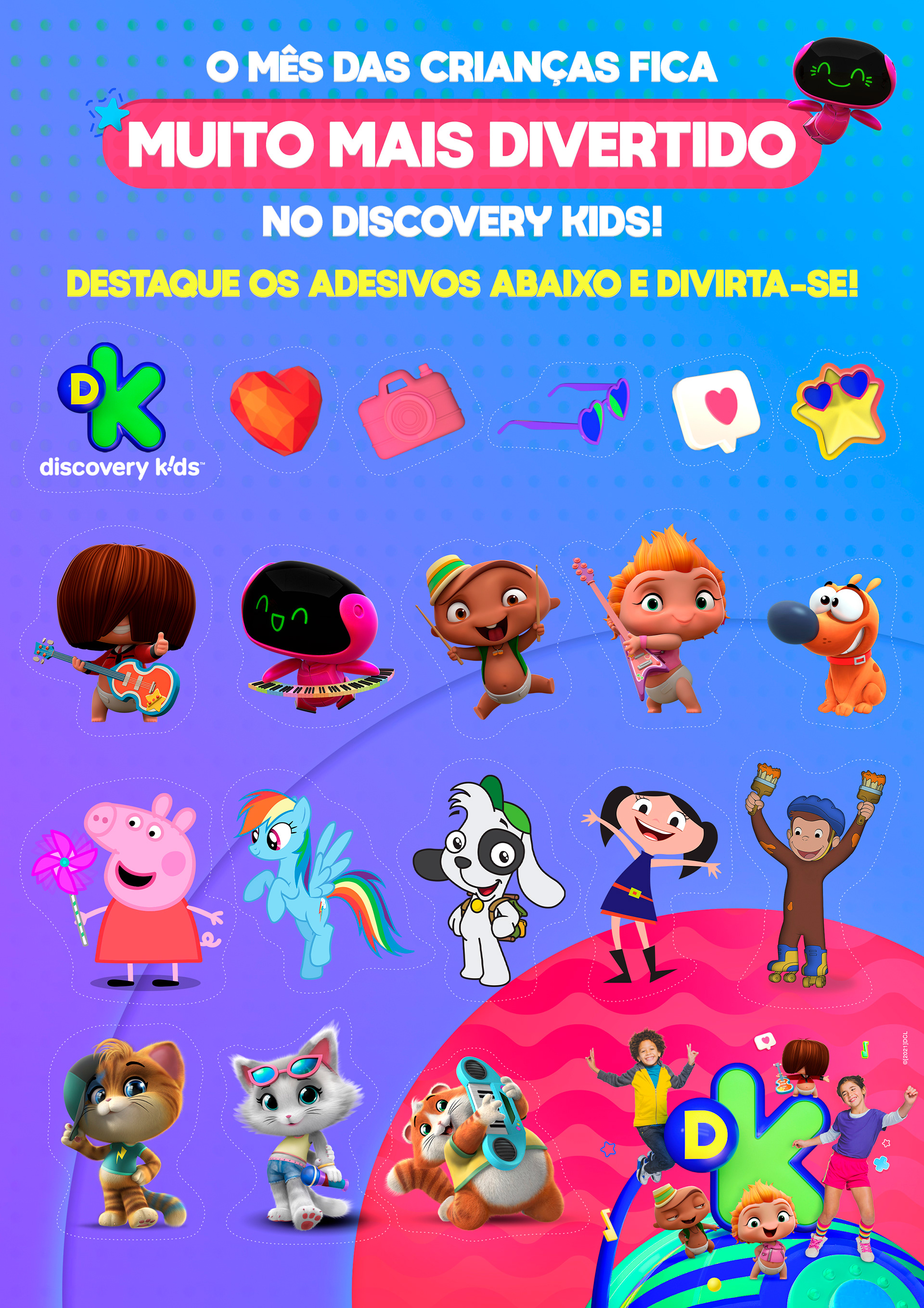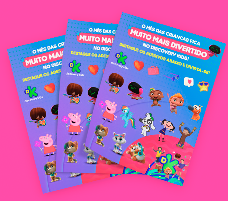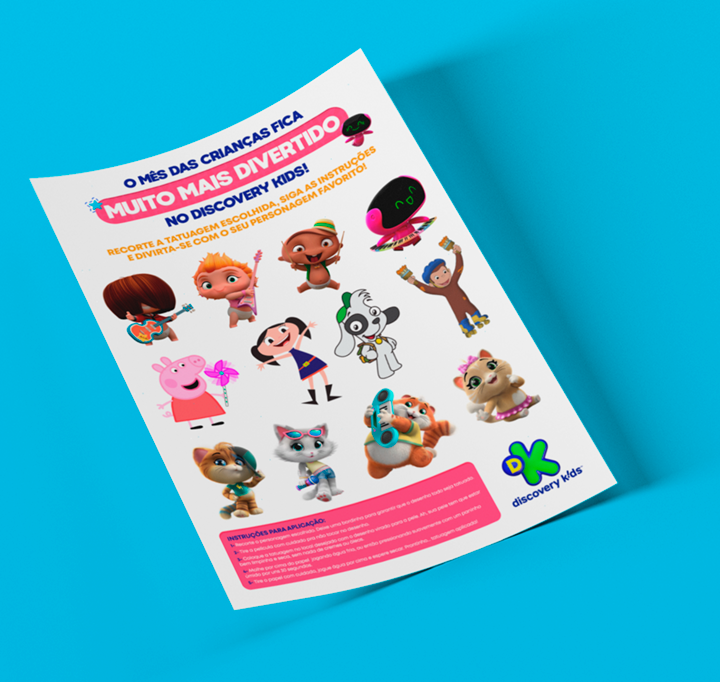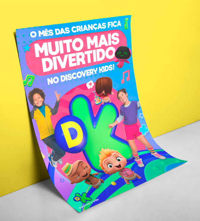 projeto desenvolvido para o mês das crianças de 2021, em parceria com o canal discovery kids, com o objetivo de criar um enxoval visual lúdico e engajador voltado ao público infantil e às famílias. a proposta criativa traz a essência alegre e educativa da marca em uma linguagem visual vibrante, multicolorida e interativa, capaz de dialogar tanto com crianças quanto com os responsáveis. foram criados elementos gráficos inspirados nos personagens e universos do canal, equilibrando diversão e didatismo. cada peça foi pensada para estimular a imaginação infantil, reforçando o papel do discovery kids como uma marca que educa por meio da fantasia e da curiosidade. a campanha contemplou diferentes frentes visuais, como: - key visual para o mês das crianças - emkt com divulgação das ações para as operadoras de tv - diretrizes visuais para ambientação e merchandising - layouts para redes sociais (posts e stories) e banners digitais - materiais promocionais de ponto de venda (cartaz, adesivos, tatuagens, livro de colorir, máscaras e paper-toy)