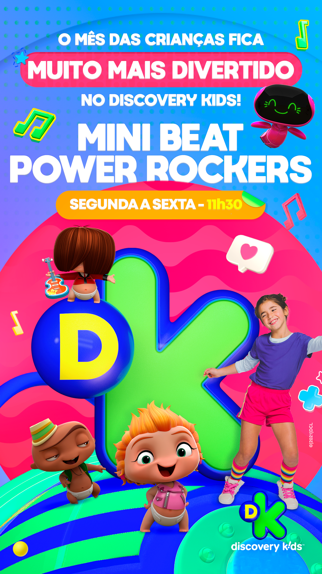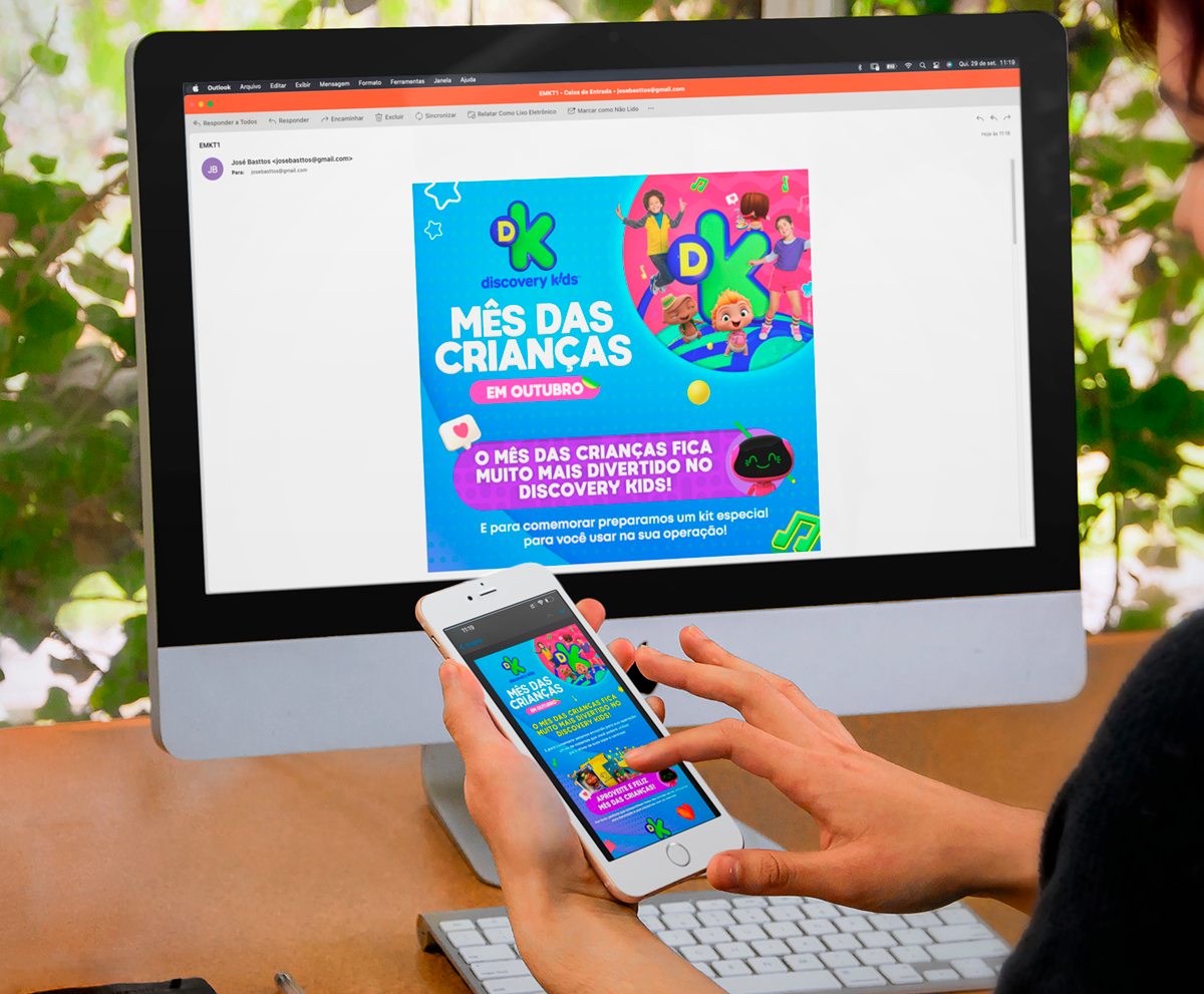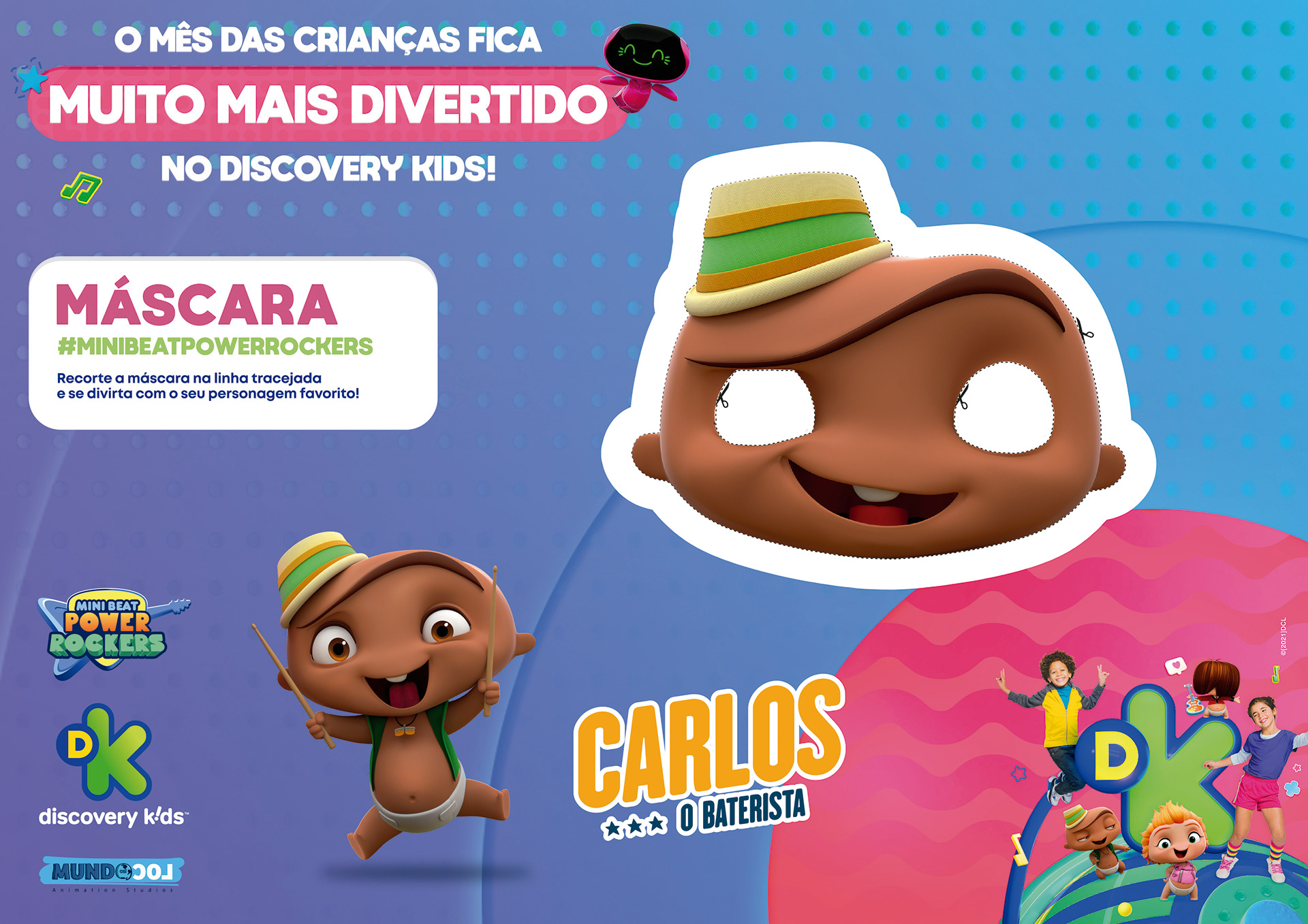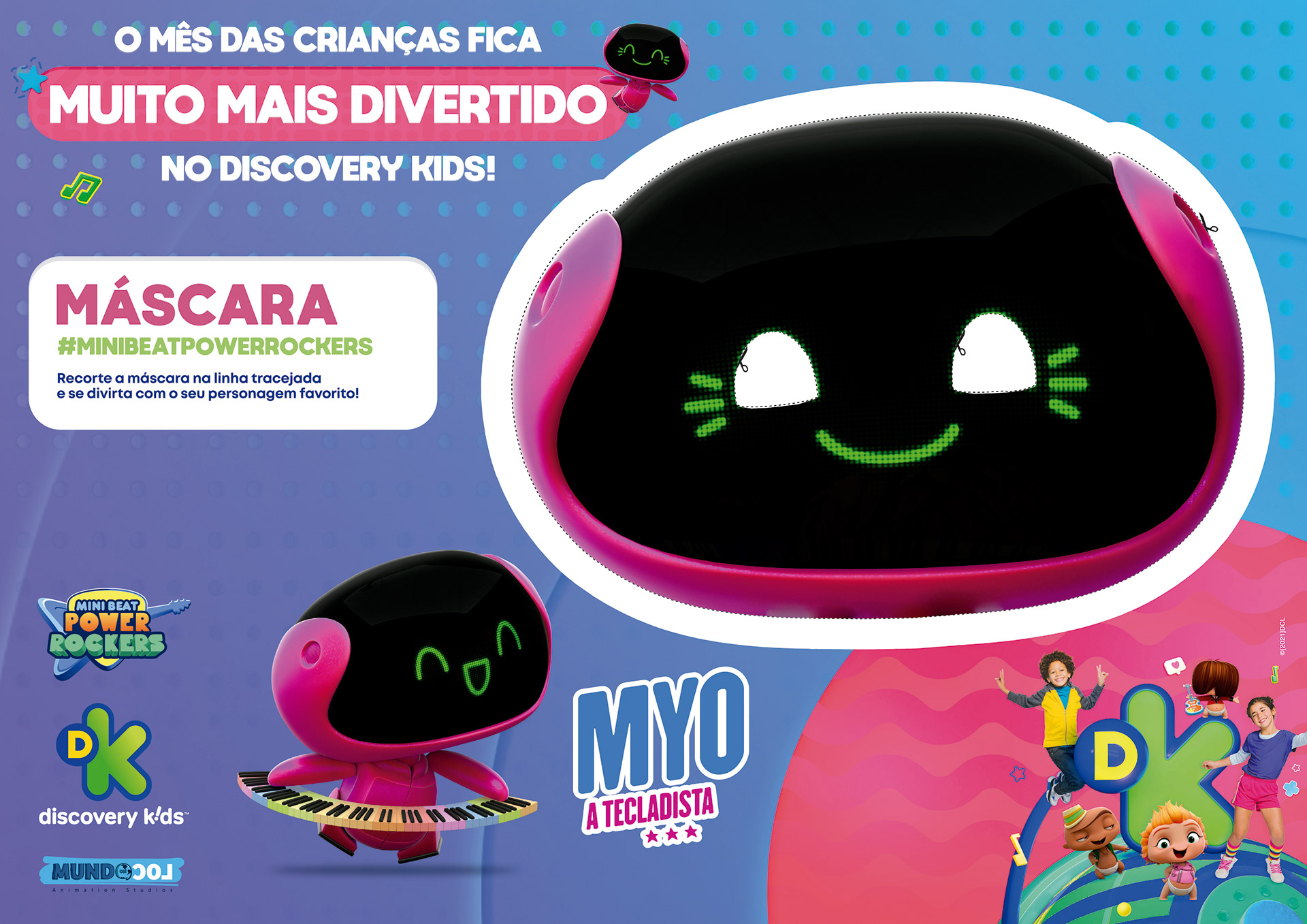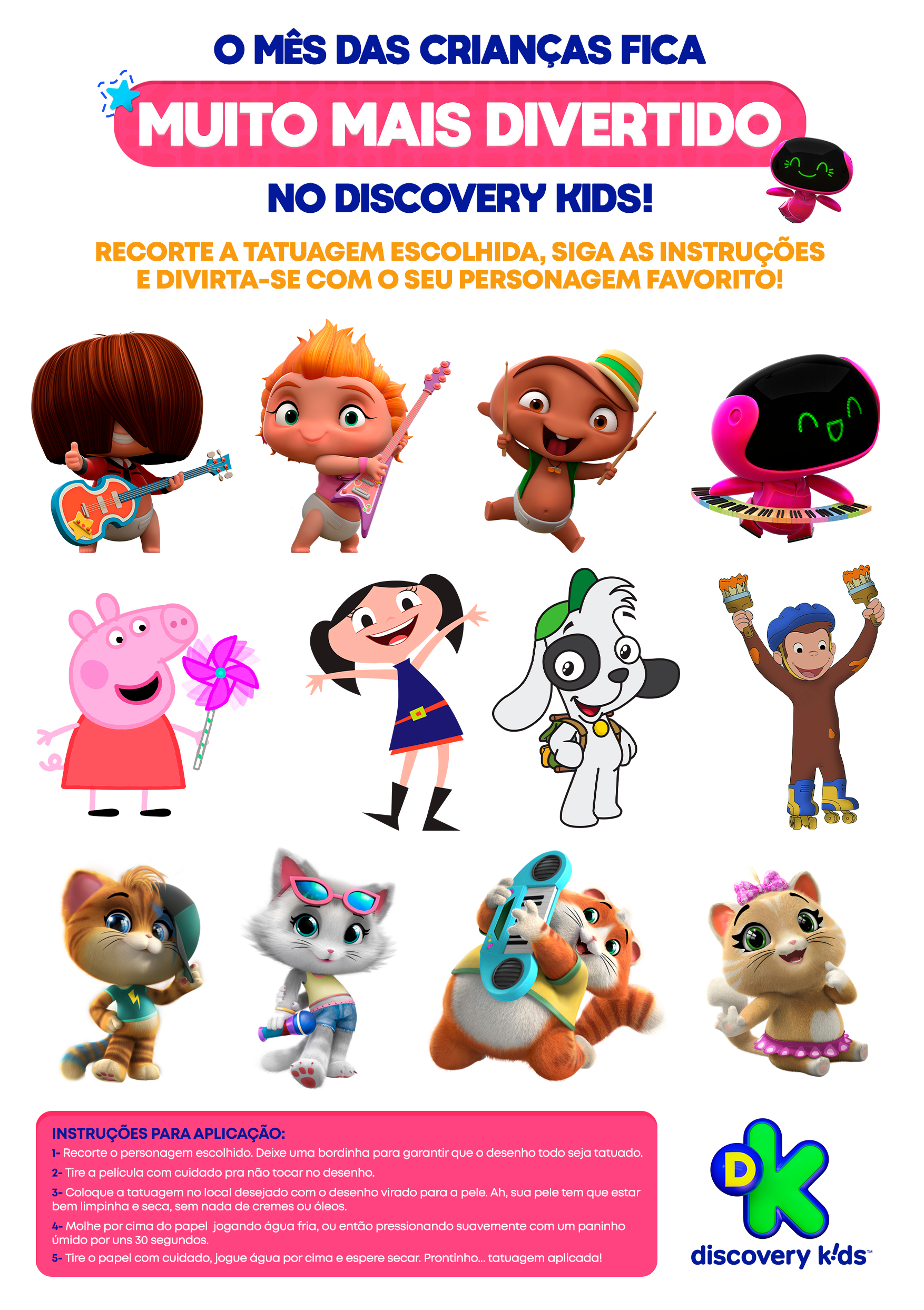 projeto desenvolvido para o mês das crianças de 2021, em parceria com o canal discovery kids, com o objetivo de criar um enxoval visual lúdico e engajador voltado ao público infantil e às famílias. a proposta criativa traz a essência alegre e educativa da marca em uma linguagem visual vibrante, multicolorida e interativa, capaz de dialogar tanto com crianças quanto com os responsáveis. foram criados elementos gráficos inspirados nos personagens e universos do canal, equilibrando diversão e didatismo. cada peça foi pensada para estimular a imaginação infantil, reforçando o papel do discovery kids como uma marca que educa por meio da fantasia e da curiosidade. a campanha contemplou diferentes frentes visuais, como: - key visual para o mês das crianças - emkt com divulgação das ações para as operadoras de tv - diretrizes visuais para ambientação e merchandising - layouts para redes sociais (posts e stories) e banners digitais - materiais promocionais de ponto de venda (cartaz, adesivos, tatuagens, livro de colorir, máscaras e paper-toy)