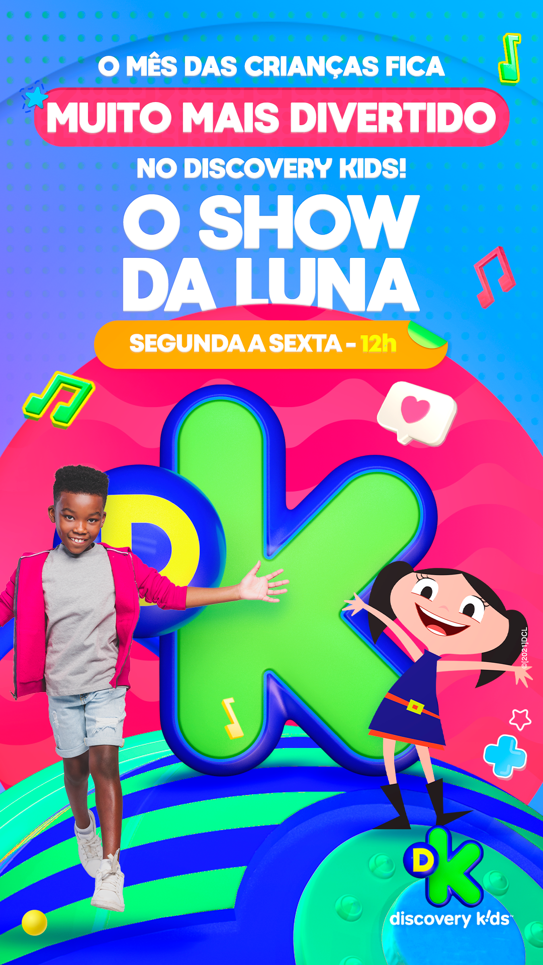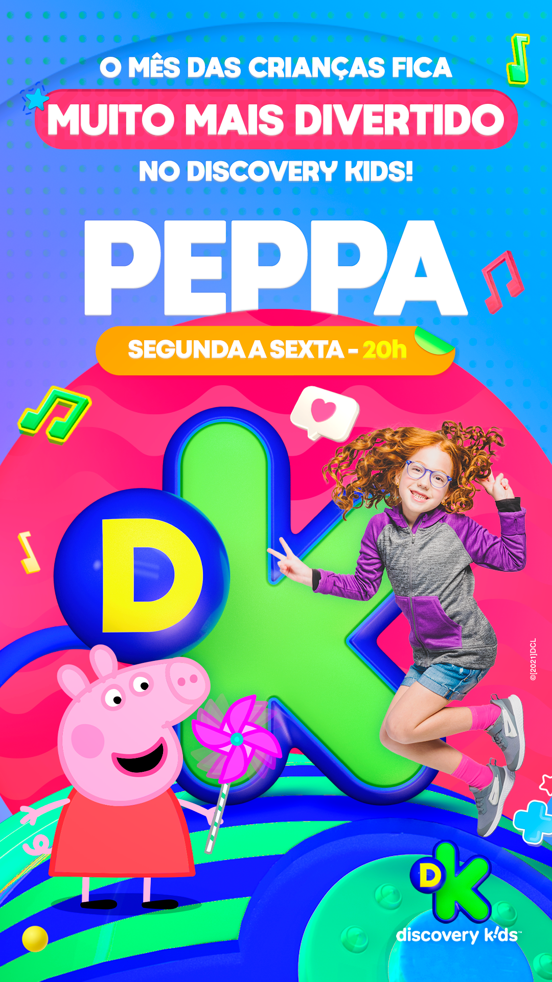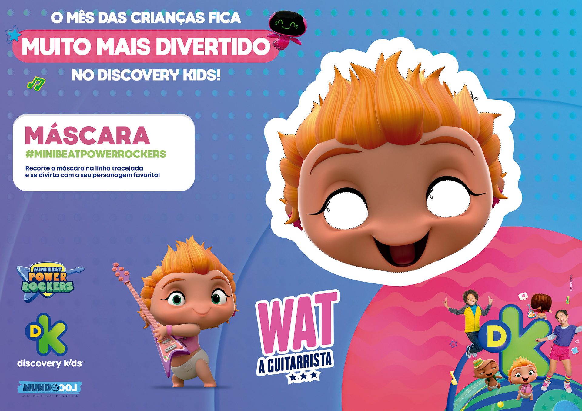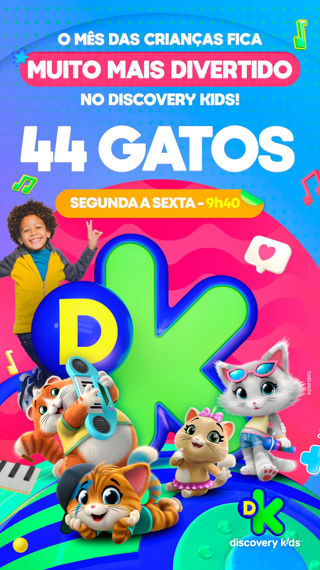 projeto desenvolvido para o mês das crianças de 2021, em parceria com o canal discovery kids, com o objetivo de criar um enxoval visual lúdico e engajador voltado ao público infantil e às famílias. a proposta criativa traz a essência alegre e educativa da marca em uma linguagem visual vibrante, multicolorida e interativa, capaz de dialogar tanto com crianças quanto com os responsáveis. foram criados elementos gráficos inspirados nos personagens e universos do canal, equilibrando diversão e didatismo. cada peça foi pensada para estimular a imaginação infantil, reforçando o papel do discovery kids como uma marca que educa por meio da fantasia e da curiosidade. a campanha contemplou diferentes frentes visuais, como: - key visual para o mês das crianças - emkt com divulgação das ações para as operadoras de tv - diretrizes visuais para ambientação e merchandising - layouts para redes sociais (posts e stories) e banners digitais - materiais promocionais de ponto de venda (cartaz, adesivos, tatuagens, livro de colorir, máscaras e paper-toy)