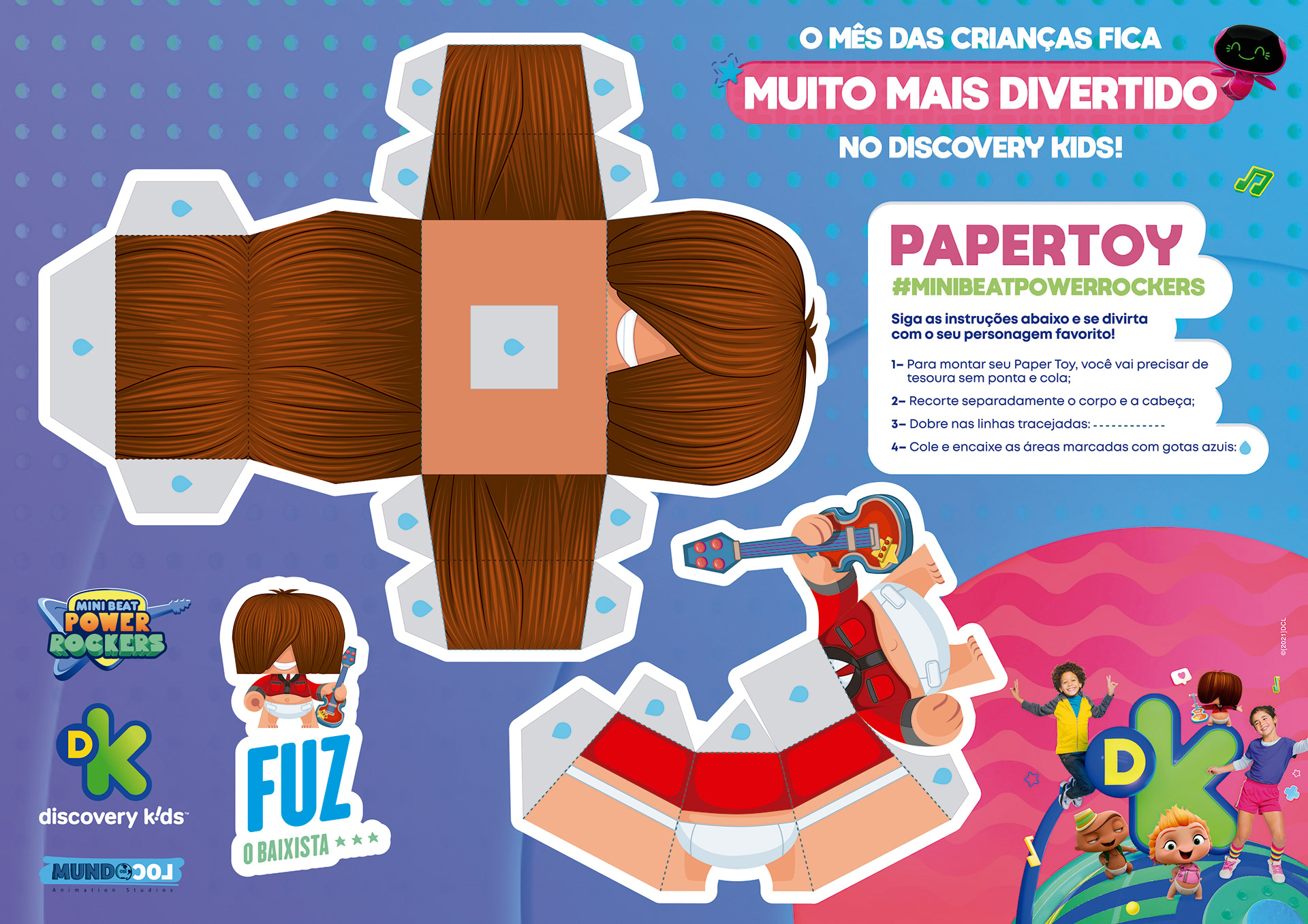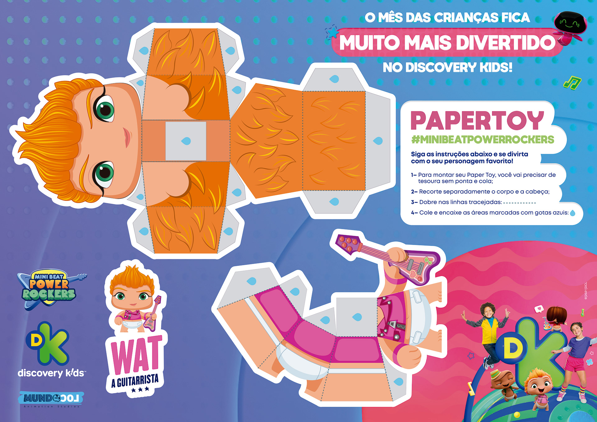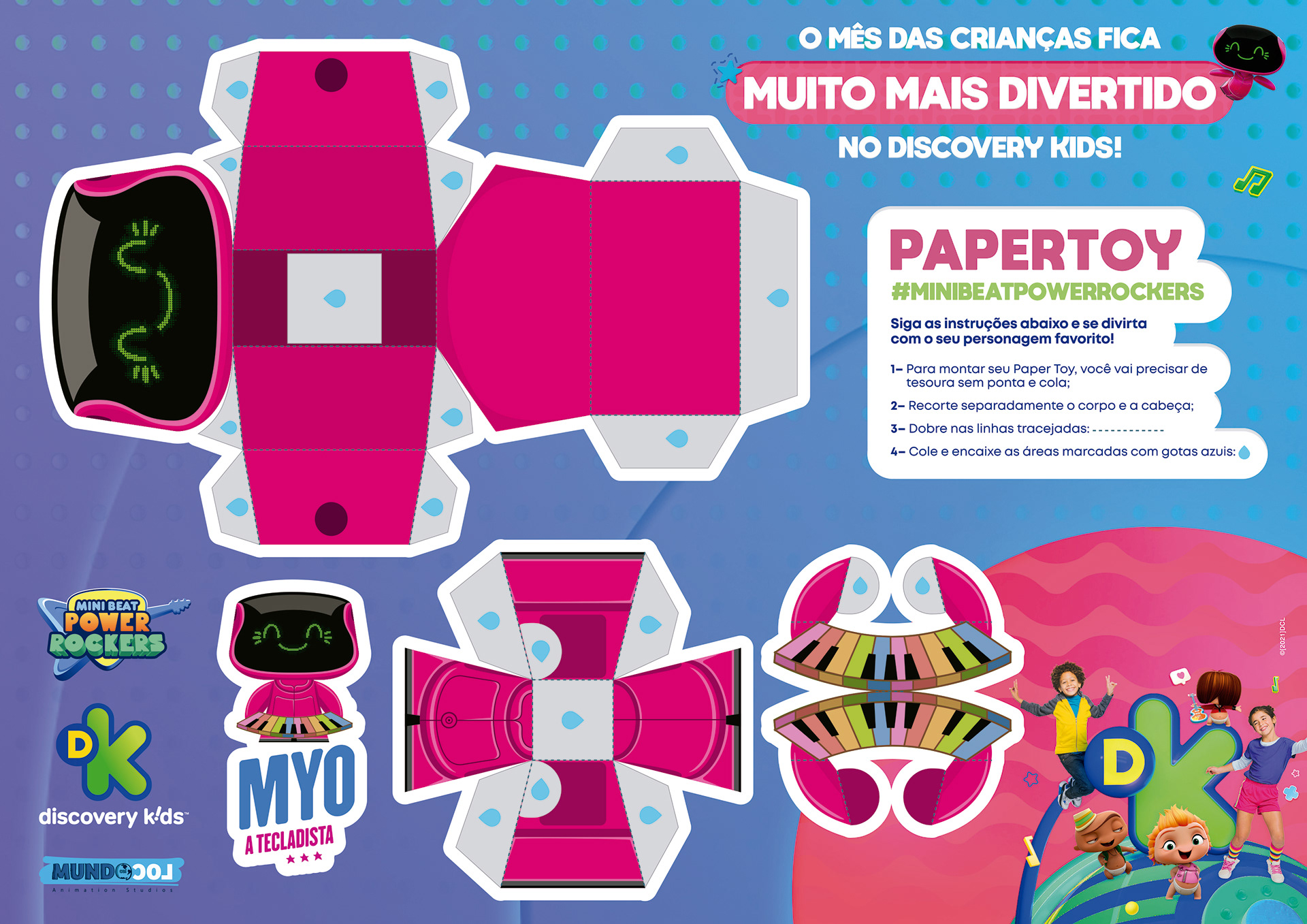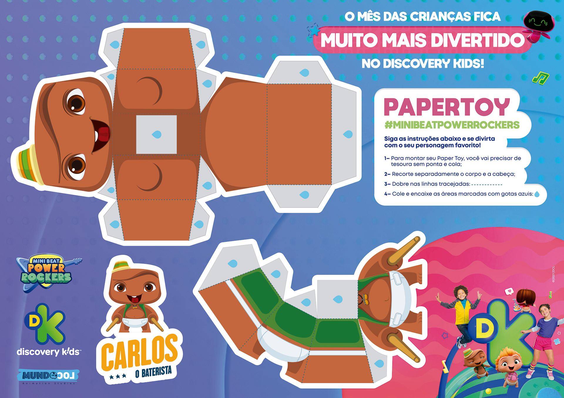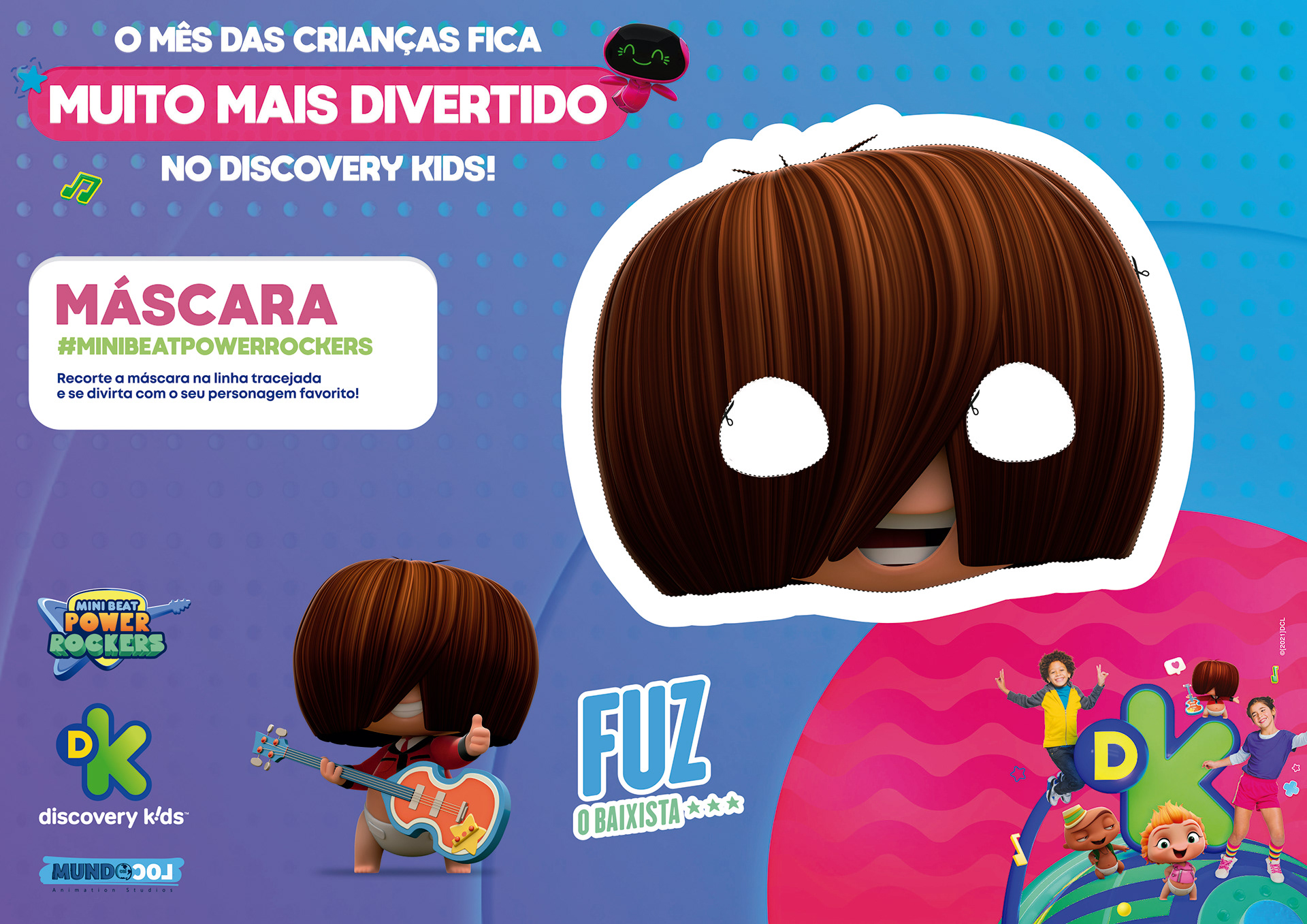 projeto desenvolvido para o mês das crianças de 2021, em parceria com o canal discovery kids, com o objetivo de criar um enxoval visual lúdico e engajador voltado ao público infantil e às famílias. a proposta criativa traz a essência alegre e educativa da marca em uma linguagem visual vibrante, multicolorida e interativa, capaz de dialogar tanto com crianças quanto com os responsáveis. foram criados elementos gráficos inspirados nos personagens e universos do canal, equilibrando diversão e didatismo. cada peça foi pensada para estimular a imaginação infantil, reforçando o papel do discovery kids como uma marca que educa por meio da fantasia e da curiosidade. a campanha contemplou diferentes frentes visuais, como: - key visual para o mês das crianças - emkt com divulgação das ações para as operadoras de tv - diretrizes visuais para ambientação e merchandising - layouts para redes sociais (posts e stories) e banners digitais - materiais promocionais de ponto de venda (cartaz, adesivos, tatuagens, livro de colorir, máscaras e paper-toy)